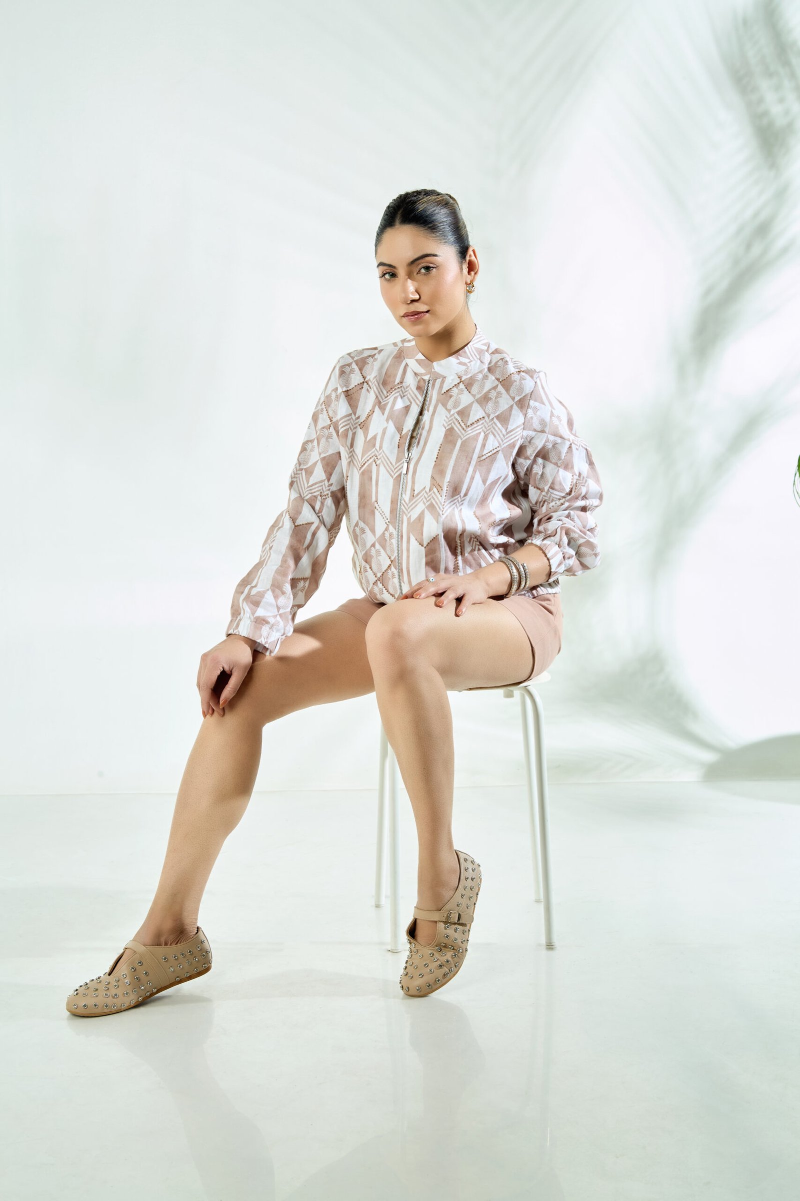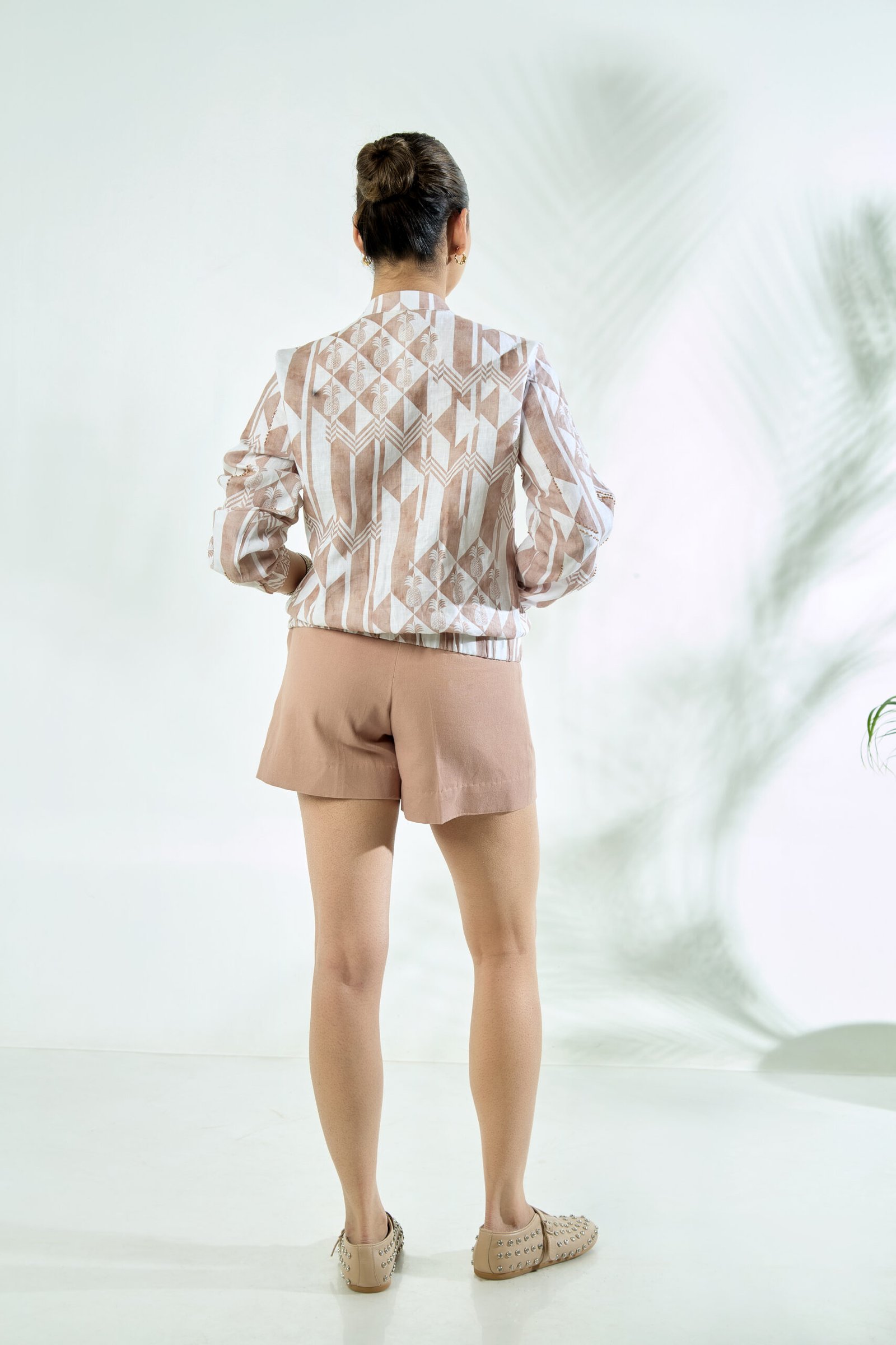 Linen abstract printed bomber jacket with pockets and hand embroidery. Paired with denim pleated shorts featuring loose double pleat style.