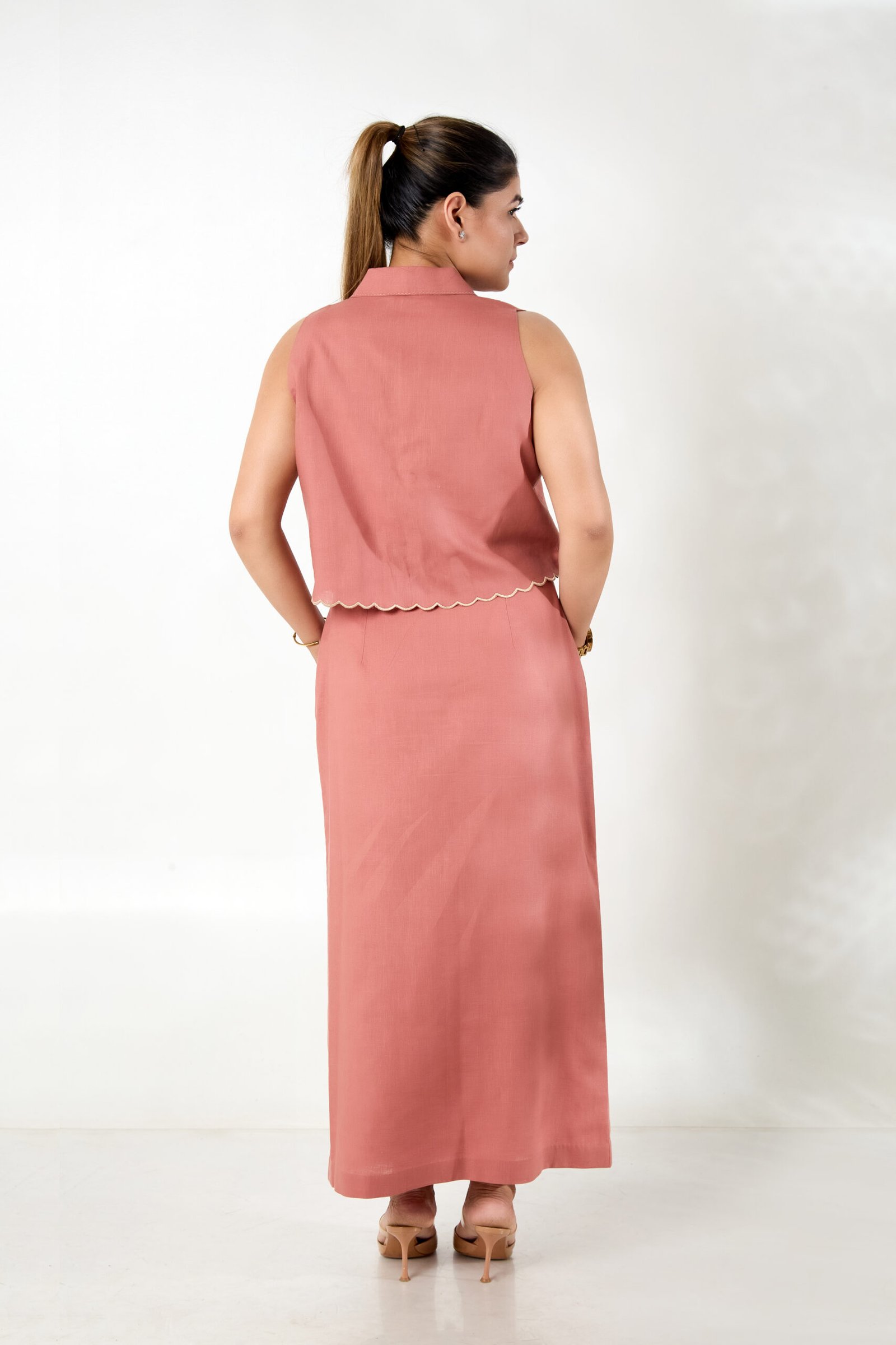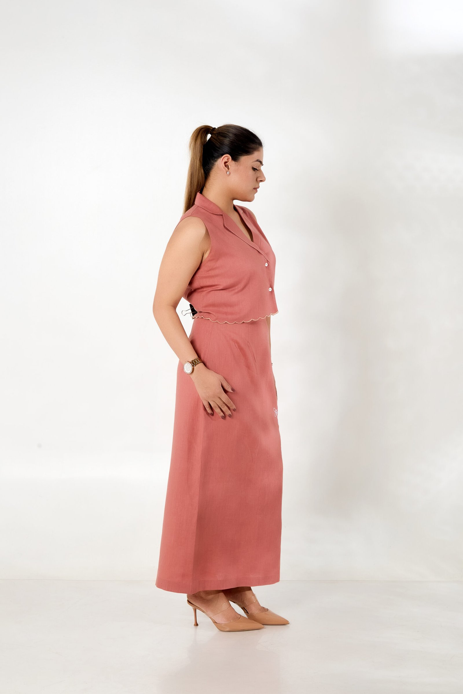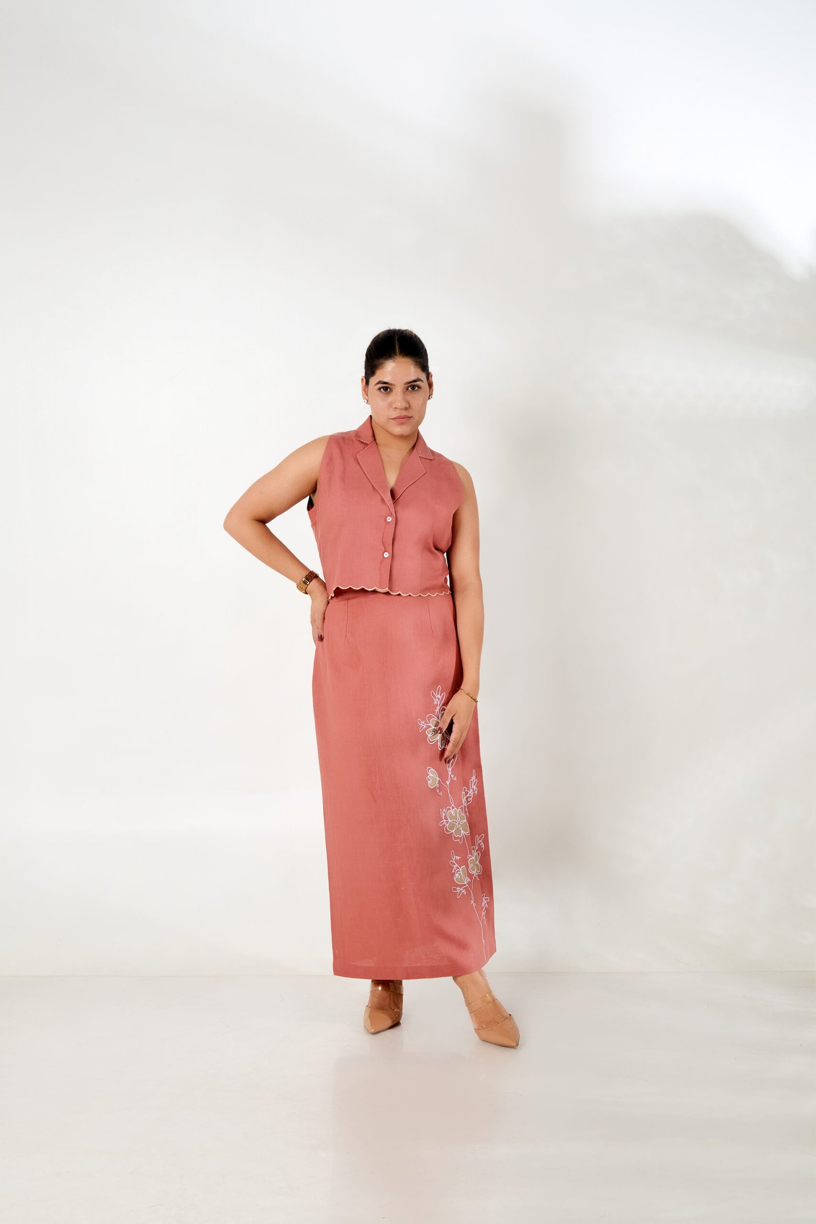 A modern coordinated set featuring a linen crop top with scalloped edges and a straight skirt with floral appliqué, balancing structure with softness.