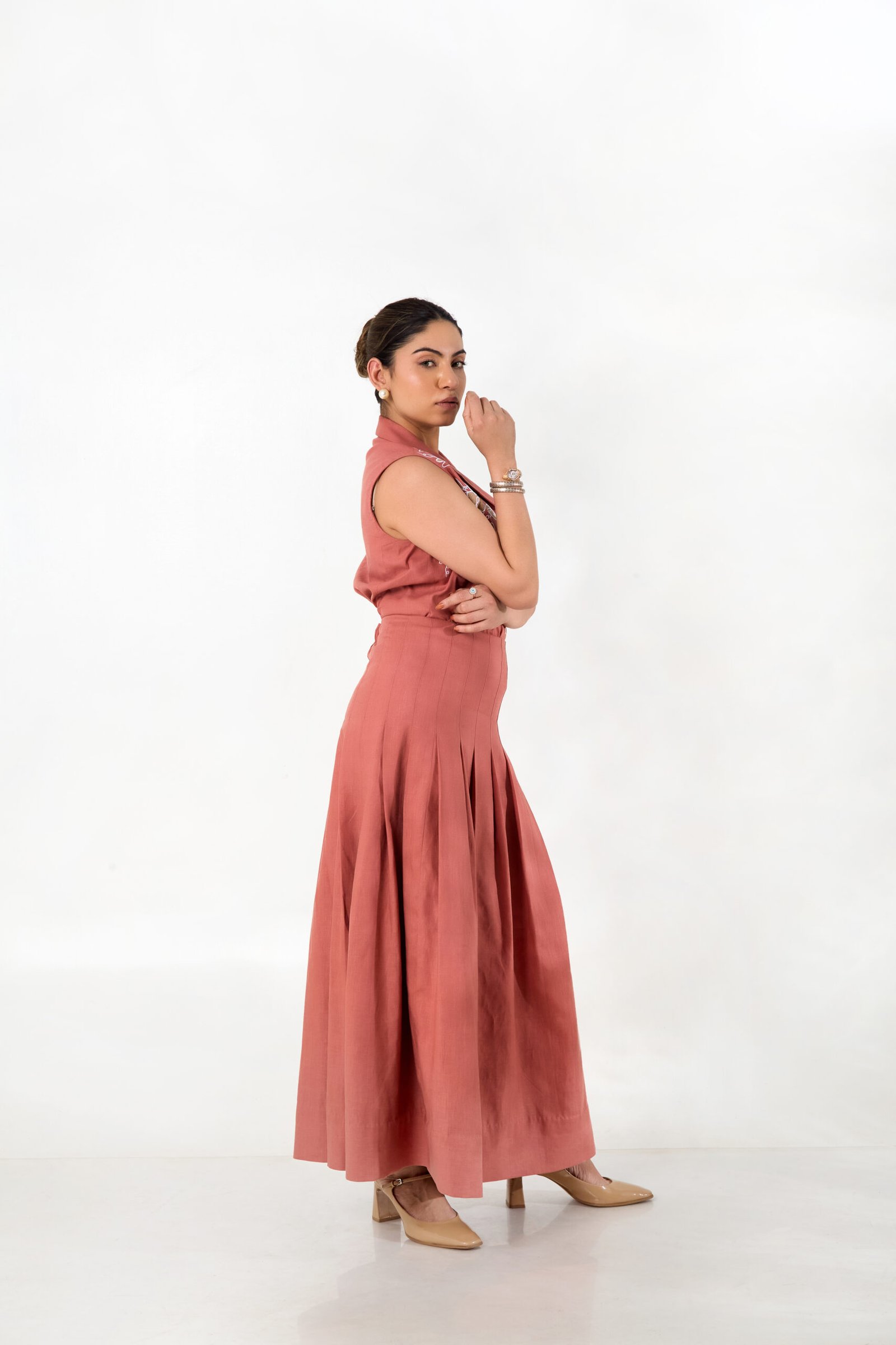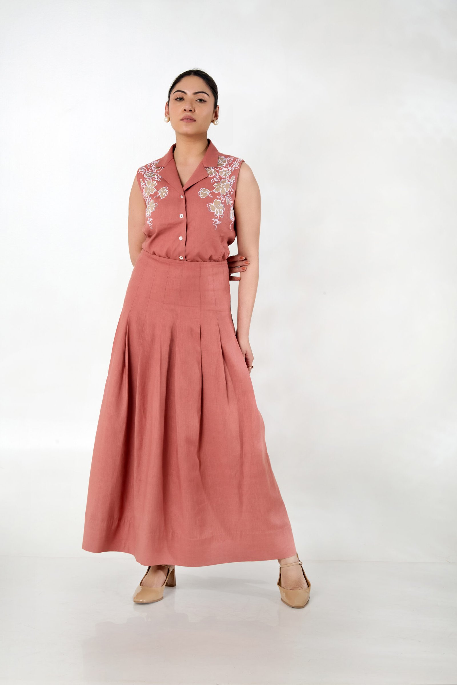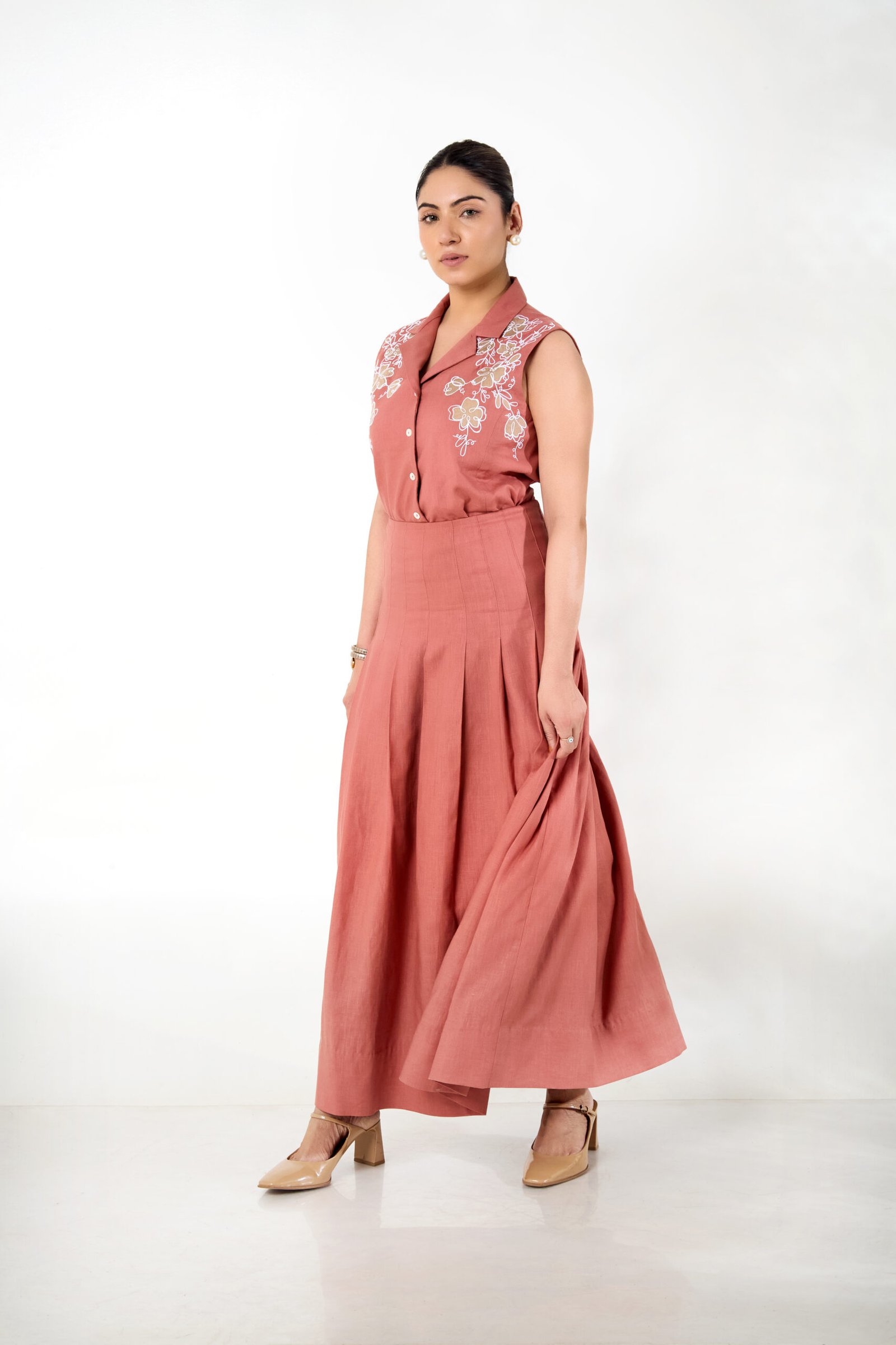 A rust-toned linen waistcoat with floral appliqué and fine detailing, paired with a fluid pleated skirt for a feminine and refined silhouette.