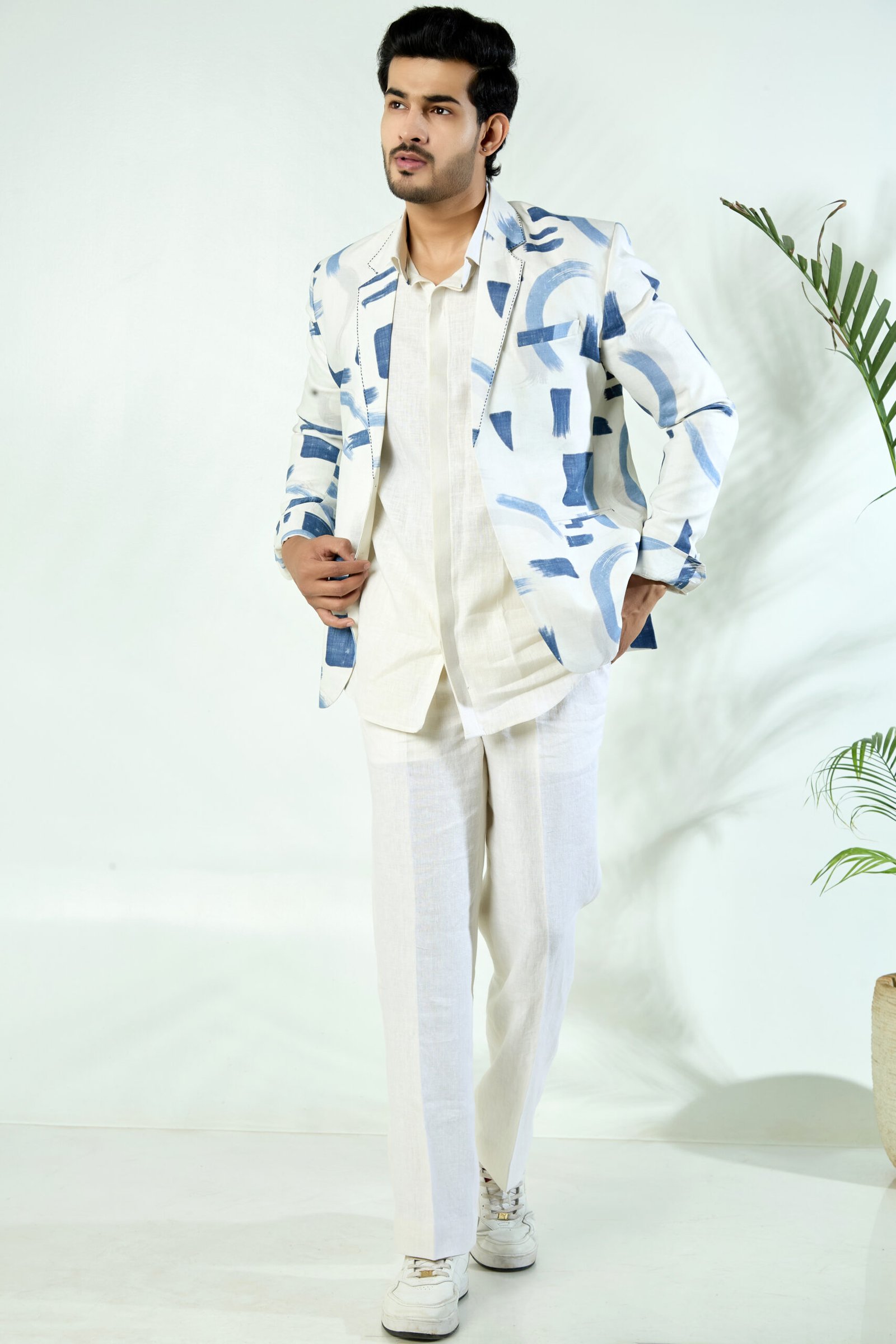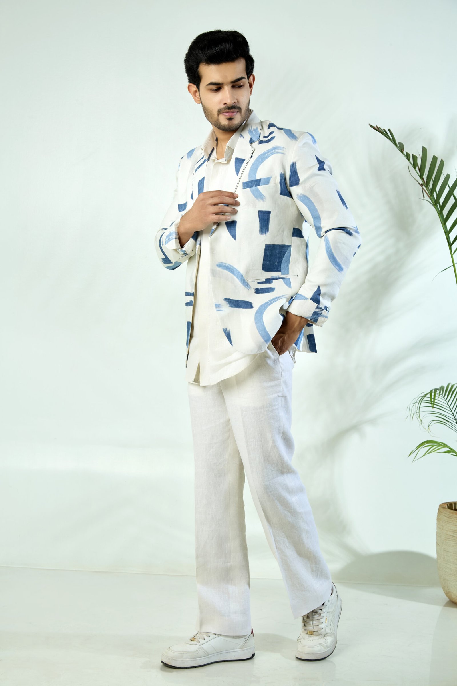 Statement printed linen blazer with modern abstract design and hand-finished detailing.