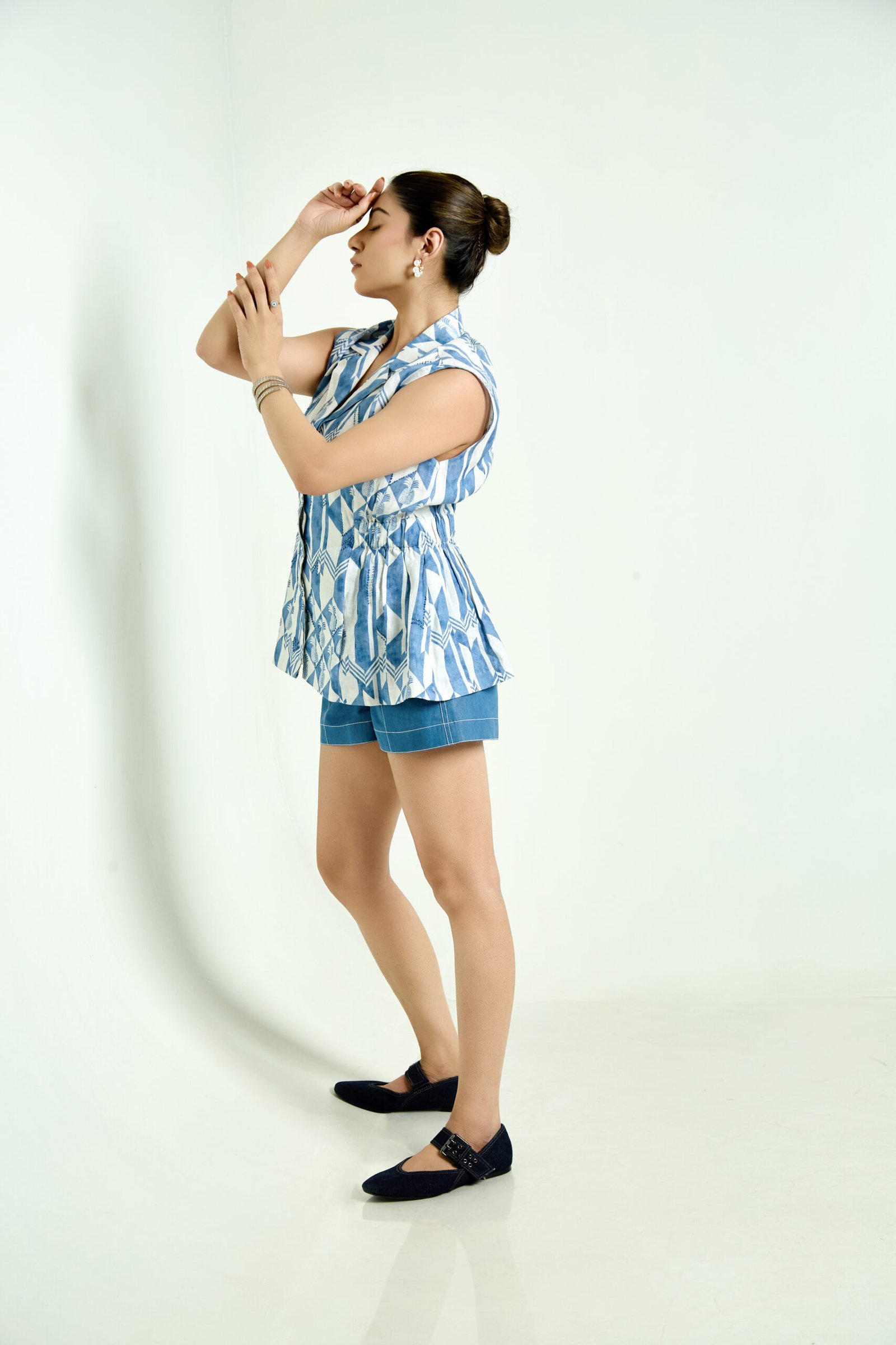 An abstract printed linen peplum top and Denim Shorts with modern embroidery and structured silhouette, ideal for effortless summer styling.