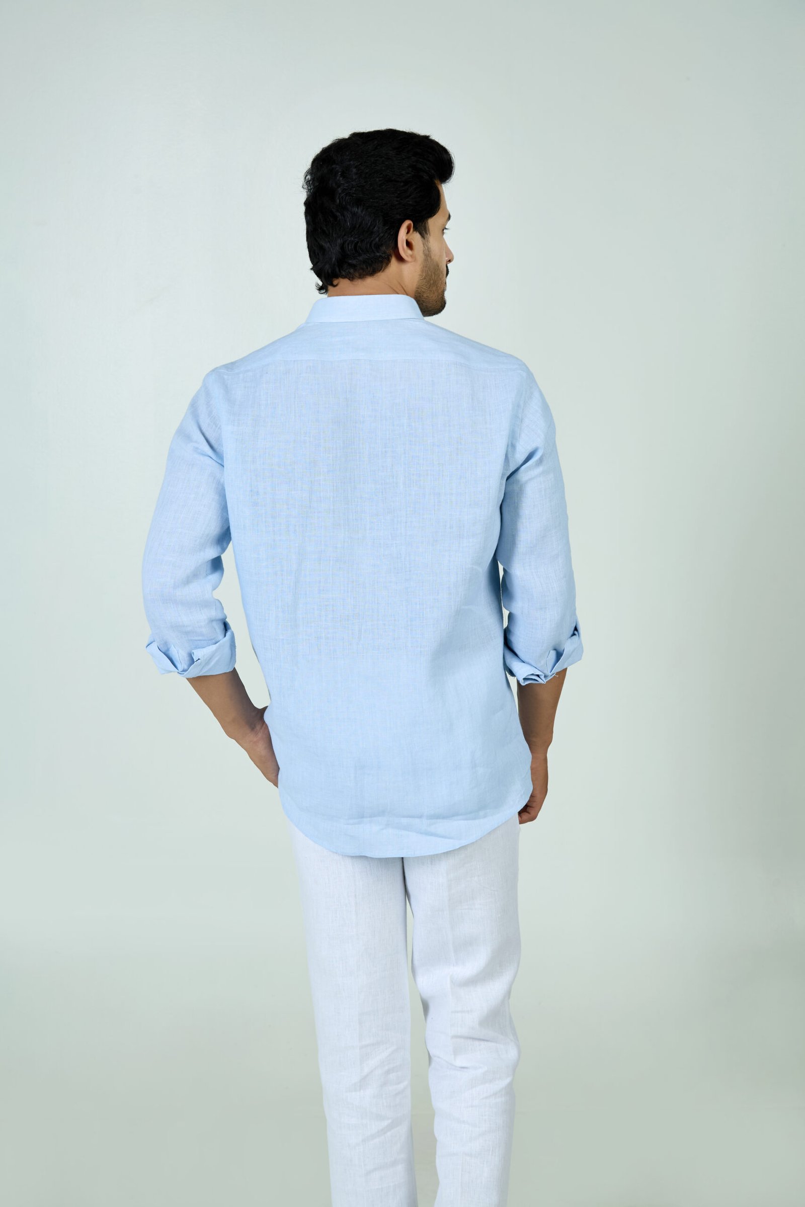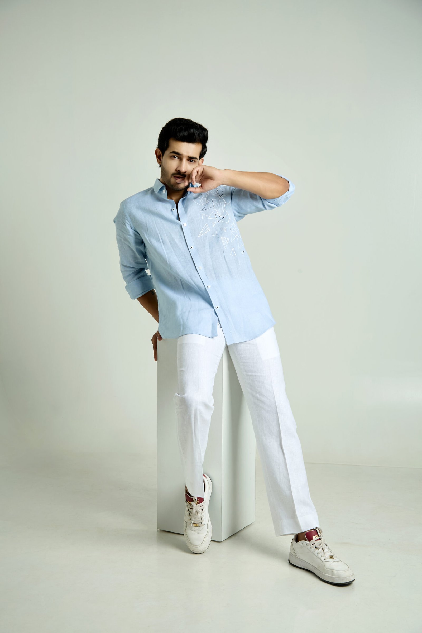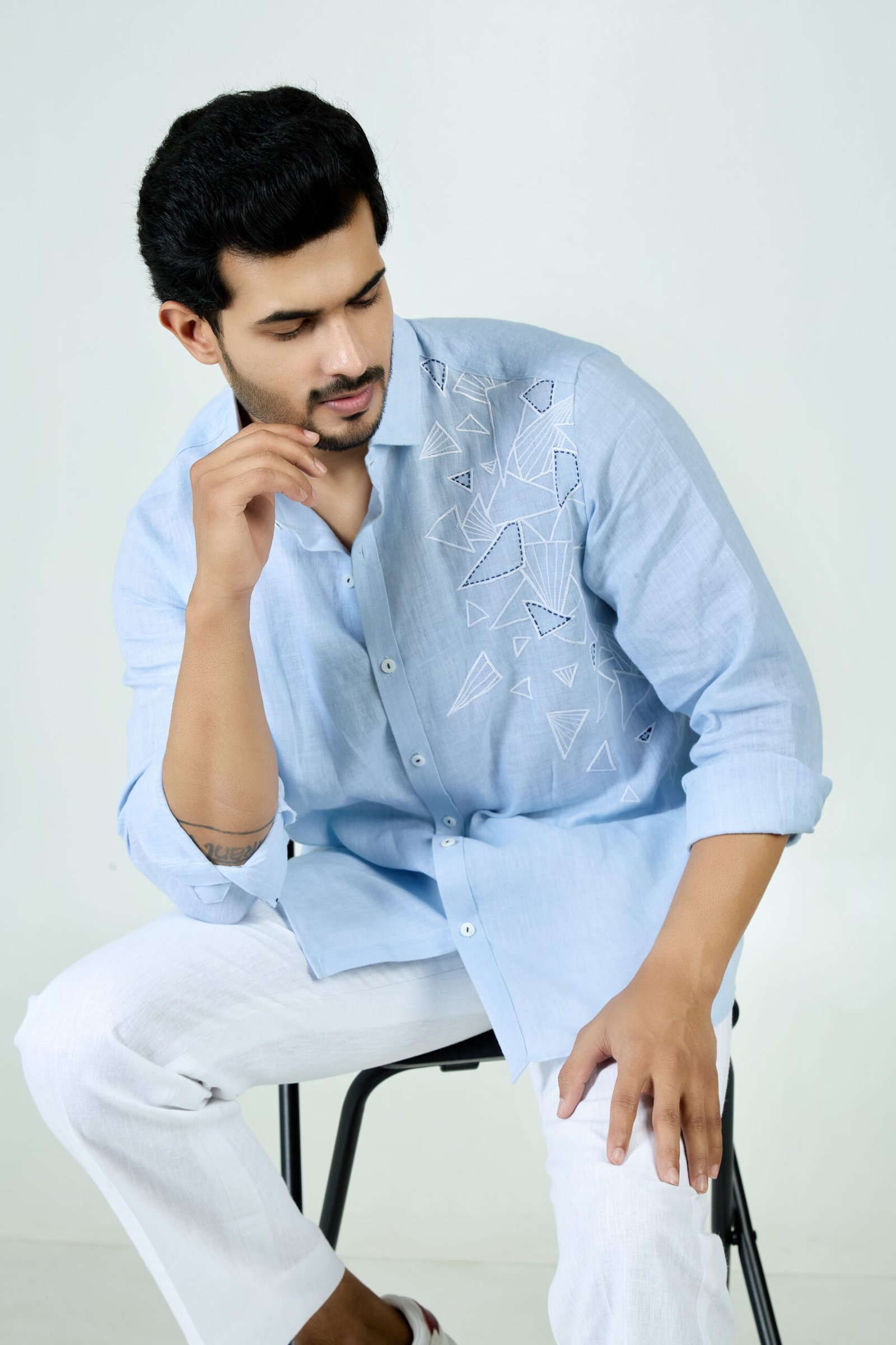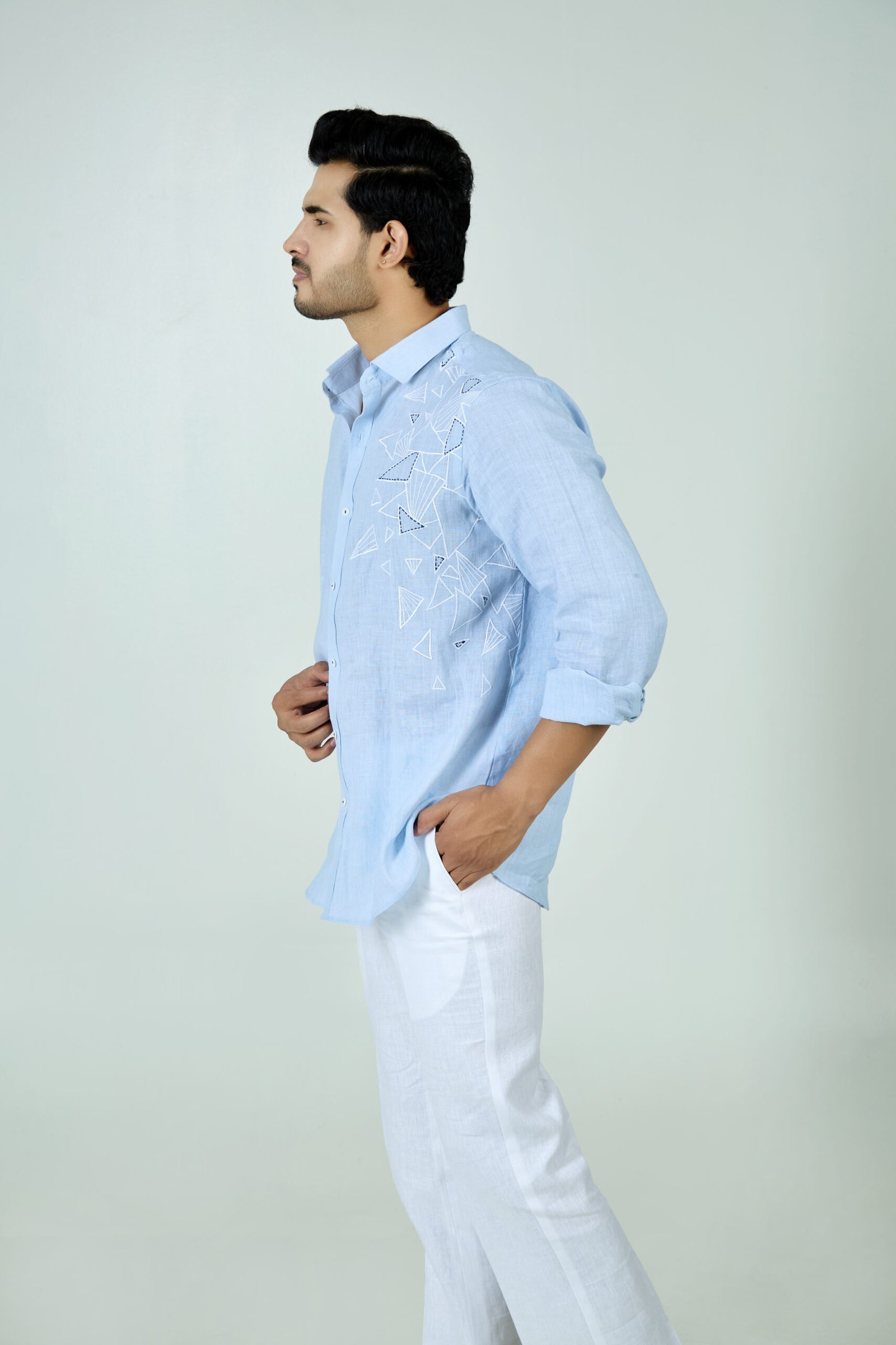 Sky blue linen shirt with abstract triangle motif and modern handcrafted detailing.